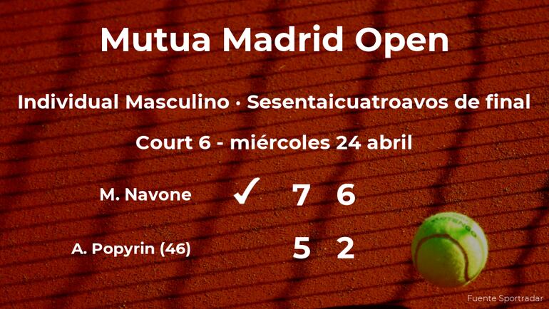 Mariano Navone, argentino ganó por 7-5 y 6-2 a Alexei Popyrin, tenista australiano, número 46 de la ATP, en los sesentaicuatroavos de final del torneo de Madrid. Con este resultado, Navone estará en los treintaidosavos de final del torneo de Madrid.