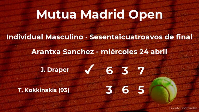 El tenista británico Jack Draper ganó por 6-3, 3-6 y 7-5 al jugador australiano Thanasi Kokkinakis, número 93 de la ATP, en los sesentaicuatroavos de final del torneo de Madrid. Con este resultado, podremos seguir viendo al vencedor del partido en los treintaidosavos de final del torneo de Madrid.