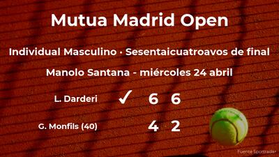 El jugador italiano Luciano Darderi ganó en los sesentaicuatroavos de final del torneo de Madrid por 6-4 y 6-2 al jugador francés Gaël Monfils, número 40 de la ATP. Tras este resultado, veremos al ganador del partido en los treintaidosavos de final del torneo de Madrid.