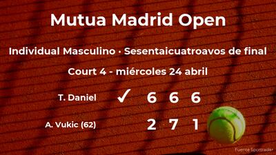 Taro Daniel, japonés venció en los sesentaicuatroavos de final del torneo de Madrid por 6-2, 6(1)-7(7) y 6-1 al tenista australiano Aleksandar Vukic, número 62 de la ATP. Con este resultado, veremos al vencedor del partido en la siguiente fase del torneo de Madrid, los treintaidosavos de final.