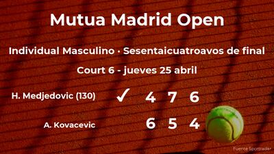 El tenista serbio Hamad Medjedovic, número 130 de la ATP, ganó por 4-6, 7-5 y 6-4 al jugador estadounidense Aleksandar Kovacevic en los sesentaicuatroavos de final del torneo de Madrid. Tras este resultado, seguiremos de cerca la trayectoria del jugador en los treintaidosavos de final del torneo.