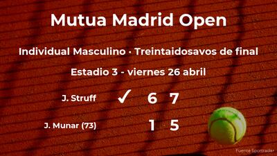 Jaume Munar, tenista español, número 73 de la ATP, quedó eliminado en los treintaidosavos de final del torneo de Madrid después de perder por 6-1 y 7-5 contra Jan-Lennard Struff, y cabeza de serie número 23. Con este resultado, el tenista consigue el puesto para los dieciseisavos de final del torneo de Madrid.