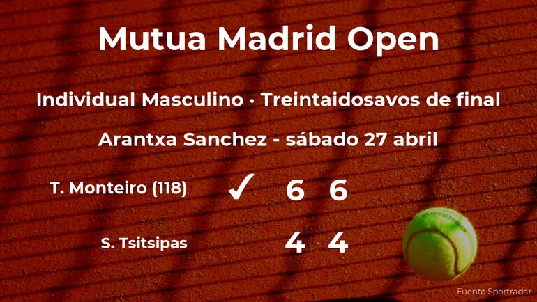 El brasileño Thiago Monteiro, número 118 de la ATP, venció en los treintaidosavos de final del torneo de Madrid por 6-4 y 6-4 a Stefanos Tsitsipas, tenista y cabeza de serie número 6. Con este resultado, el tenista brasileño logra clasificarse para los dieciseisavos de final del torneo de Madrid.