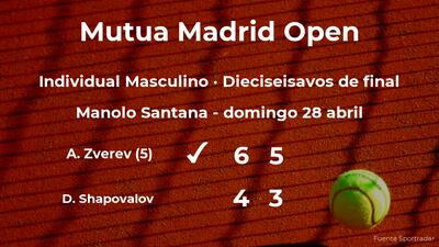 Alexander Zverev,, número 5 de la ATP y cabeza de serie número 4, ganó en los dieciseisavos de final del torneo de Madrid por 6-4 y 5-3 al canadiense Denis Shapovalov. Con este resultado, el jugador estará en los octavos de final del torneo de Madrid.
