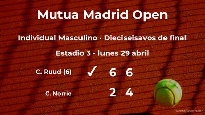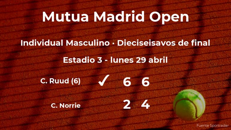 Casper Ruud, noruego, número 6 de la ATP y cabeza de serie número 5, ganó por 6-2 y 6-4 al jugador británico Cameron Norrie y cabeza de serie número 29, en los dieciseisavos de final del torneo de Madrid. Con este resultado, el ganador estará en los octavos de final del torneo de Madrid.