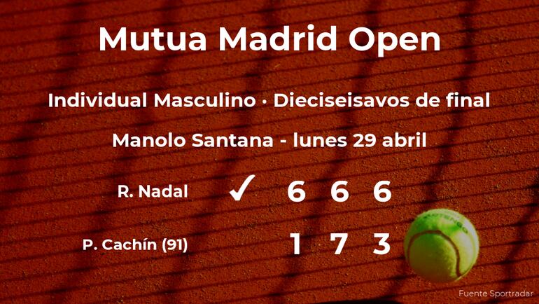 Rafael Nadal, español ganó por 6-1, 6(5)-7(7) y 6-3 a Pedro Cachín, tenista argentino, número 91 de la ATP, en los dieciseisavos de final del torneo de Madrid. Con este resultado, seguiremos viendo al vencedor del partido en los octavos de final del torneo de Madrid.