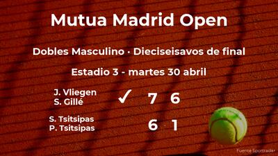 Los belgas Joran Vliegen y Sander Gillé vencieron por 7(7)-6(3) y 6-1 a Stefanos Tsitsipas y Petros Tsitsipas, número 7 de la ATP y respectivamente en los dieciseisavos de final del torneo de Madrid. Tras este resultado, veremos a los ganadores del partido en la siguiente fase del torneo de Madrid, los octavos de final.