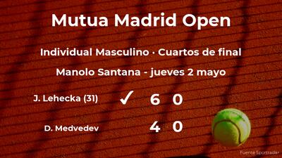 Jirí Lehecka, checo, número 31 de la ATP y cabeza de serie número 30, venció en los cuartos de final del torneo de Madrid por 6-4 y 0-0 al tenista ruso Daniil Medvedev y cabeza de serie número 3. Tras este resultado, el checo consigue el puesto para la siguiente fase del torneo de Madrid.