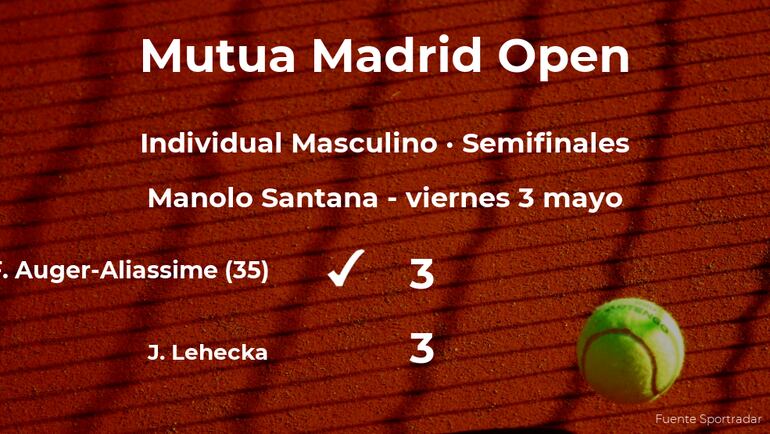 Félix Auger-Aliassime, canadiense, número 35 de la ATP, venció por 3-3 a Jirí Lehecka, tenista checo y cabeza de serie número 30, en las semifinales del torneo de Madrid. Tras este resultado, el tenista canadiense estará en la siguiente fase del torneo de Madrid.