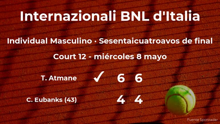 Terence Atmane, francés venció por 6-4 y 6-4 a Christopher Eubanks, tenista estadounidense, número 43 de la ATP, en los sesentaicuatroavos de final del torneo de Roma. Tras este resultado, podremos seguir viendo al ganador del partido en la siguiente fase del torneo de Roma, los treintaidosavos de final.