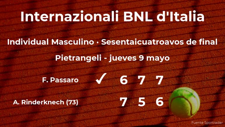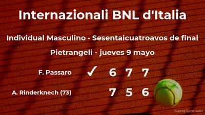 El italiano Francesco Passaro ganó en los sesentaicuatroavos de final del torneo de Roma por 6(3)-7(7), 7-5 y 7(9)-6(7) a Arthur Rinderknech, tenista francés, número 73 de la ATP. Con este resultado, el jugador italiano se hace con la plaza para los treintaidosavos de final del torneo de Roma.