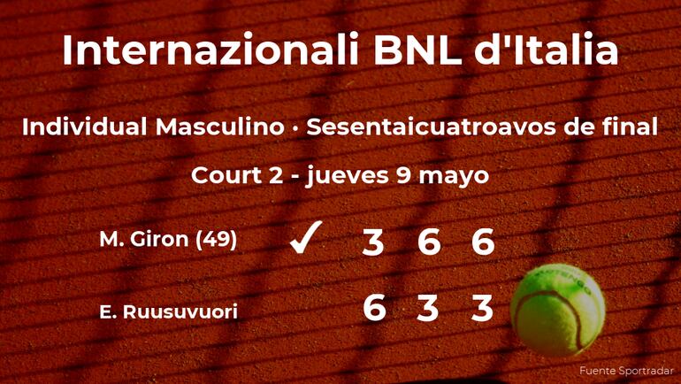 Marcos Giron, estadounidense, número 49 de la ATP, venció por 3-6, 6-3 y 6-3 al jugador finlandés Emil Ruusuvuori en los sesentaicuatroavos de final del torneo de Roma. Con este resultado, el tenista consigue clasificarse para los treintaidosavos de final del torneo de Roma.