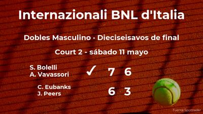Los jugadores italianos Simone Bolelli y Andrea Vavassori vencieron por 7(7)-6(4) y 6-3 al jugador estadounidense Christopher Eubanks y al jugador australiano John Peers en los dieciseisavos de final del torneo de Roma. Tras este resultado, la pareja estará en los octavos de final del torneo de Roma.