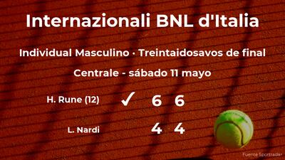 Holger Rune, número 12 de la ATP y cabeza de serie número 10, ganó en los treintaidosavos de final del torneo de Roma por 6-4 y 6-4 a Luca Nardi, tenista italiano. Tras este resultado, seguiremos viendo al ganador del partido en la siguiente fase del torneo de Roma, los dieciseisavos de final.