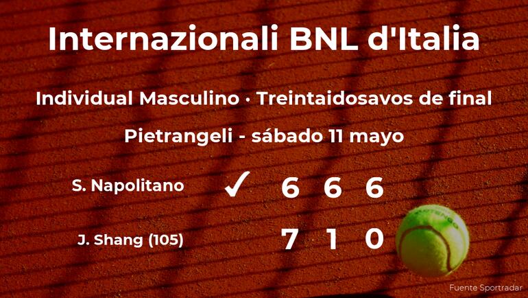 El tenista italiano Stefano Napolitano ganó por 6(3)-7(7), 6-1 y 6-0 al chino Juncheng Shang, número 105 de la ATP, en los treintaidosavos de final del torneo de Roma. Tras este resultado, seguiremos de cerca la trayectoria del jugador en los dieciseisavos de final del torneo.