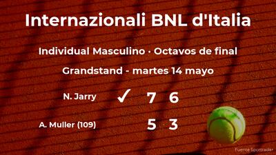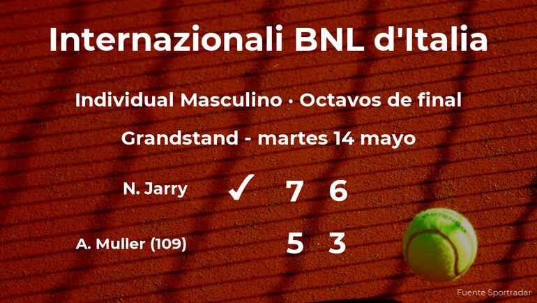 Nicolás Jarry y cabeza de serie número 21, venció en los octavos de final del torneo de Roma por 7-5 y 6-3 al francés Alexandre Muller, número 109 de la ATP. Con este resultado, Jarry se hace con la plaza para la siguiente fase del torneo de Roma.