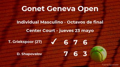 Tallon Griekspoor,, número 27 de la ATP y cabeza de serie número 6, ganó en los octavos de final del torneo de Ginebra por 6(7)-7(9), 7(7)-6(4) y 6-3 al tenista canadiense Denis Shapovalov. Con este resultado, seguiremos de cerca la trayectoria del jugador en la siguiente ronda de la competición.