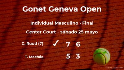 Casper Ruud, noruego, número 7 de la ATP y cabeza de serie número 2, venció por 7-5 y 6-3 a Tomáš Machác, tenista checo en la final del torneo de Ginebra. Con este resultado, el jugador se convierte en el nuevo campeón del torneo de Ginebra.