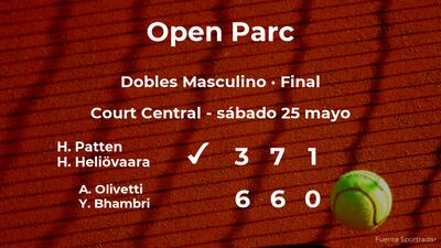 El británico Henry Patten y el jugador finlandés Harri Heliövaara ganaron por 3-6, 7(7)-6(4) y 1-0 (para romper el empate) al tenista francés Albano Olivetti y al jugador indio Yuki Bhambri en la final del torneo de Lyon. Tras este resultado, los jugadores son los nuevos campeones del torneo de Lyon.