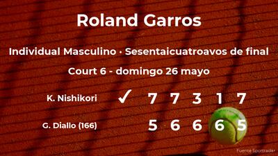 El tenista japonés Kei Nishikori ganó por 7-5, 7(7)-6(3), 3-6, 1-6 y 7-5 a Gabriel Diallo, tenista canadiense, número 166 de la ATP, en los sesentaicuatroavos de final del torneo de París. Con este resultado, veremos al vencedor del partido en la siguiente fase del torneo de París, los treintaidosavos de final.