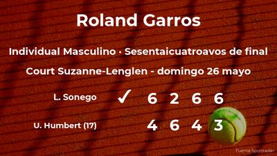 Lorenzo Sonego, italiano venció en los sesentaicuatroavos de final del torneo de París por 6-4, 2-6, 6-4 y 6-3 a Ugo Humbert, tenista francés, número 17 de la ATP y cabeza de serie número 17. Tras este resultado, podremos seguir viendo al vencedor del partido en la siguiente fase del torneo de París, los treintaidosavos de final.