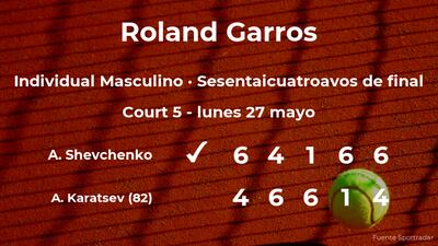 El kazajo Alexander Shevchenko venció en los sesentaicuatroavos de final del torneo de París por 6-4, 4-6, 1-6, 6-1 y 6-4 al jugador ruso Aslan Karatsev, número 82 de la ATP. Con este resultado, veremos al vencedor del partido en los treintaidosavos de final del torneo de París.