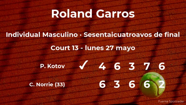 Pavel Kotov, ruso venció por 4-6, 6-3, 3-6, 7(7)-6(5) y 6-2 a Cameron Norrie, tenista británico, número 33 de la ATP y cabeza de serie número 32, en los sesentaicuatroavos de final del torneo de París. Con este resultado, veremos al ganador del partido en los treintaidosavos de final del torneo de París.