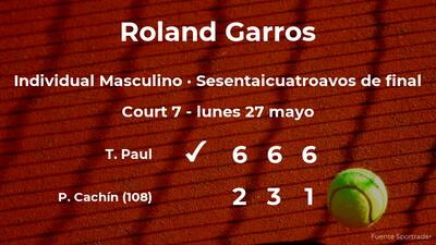 Tommy Paul, estadounidense y cabeza de serie número 14, venció por 6-2, 6-3 y 6-1 a Pedro Cachín, tenista argentino, número 108 de la ATP, en los sesentaicuatroavos de final del torneo de París. Tras este resultado, podremos seguir viendo al ganador del partido en la siguiente fase del torneo de París, los treintaidosavos de final.
