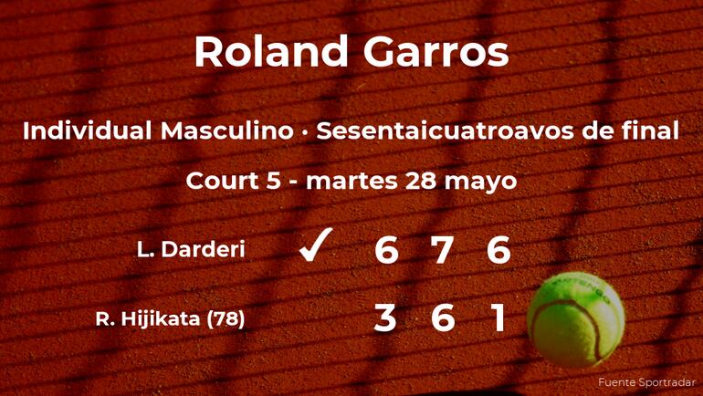 Luciano Darderi, italiano venció en los sesentaicuatroavos de final del torneo de París por 6-3, 7(8)-6(6) y 6-1 al jugador australiano Rinky Hijikata, número 78 de la ATP. Con este resultado, el ganador estará en los treintaidosavos de final del torneo de París.