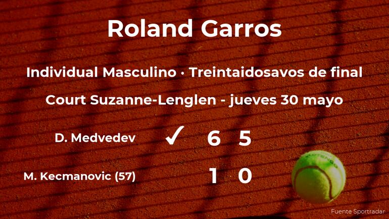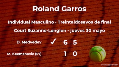 Daniil Medvedev, ruso y cabeza de serie número 5, ganó en los treintaidosavos de final del torneo de París por 6-1 y 5-0 a Miomir Kecmanovic, tenista serbio, número 57 de la ATP. Tras este resultado, seguiremos viendo al ganador del partido en la siguiente fase del torneo de París, los dieciseisavos de final.