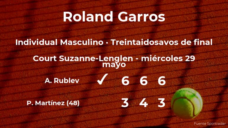 Andrey Rublev, ruso y cabeza de serie número 6, ganó por 6-3, 6-4 y 6-3 a Pedro Martínez, tenista español, número 48 de la ATP, en los treintaidosavos de final del torneo de París. Tras este resultado, el ruso consigue la plaza para los dieciseisavos de final del torneo de París.