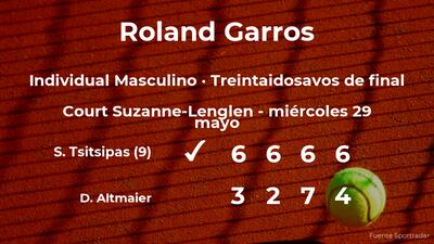 Stefanos Tsitsipas,, número 9 de la ATP y cabeza de serie número 9, venció en los treintaidosavos de final del torneo de París por 6-3, 6-2, 6(2)-7(7) y 6-4 a Daniel Altmaier, tenista. Tras este resultado, Tsitsipas se hace con la plaza para los dieciseisavos de final del torneo de París.