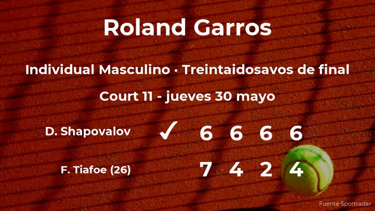 El tenista canadiense Denis Shapovalov venció por 6(4)-7(7), 6-4, 6-2 y 6-4 a Frances Tiafoe, tenista estadounidense, número 26 de la ATP y cabeza de serie número 25, en los treintaidosavos de final del torneo de París. Tras este resultado, veremos al ganador del partido en los dieciseisavos de final del torneo de París.