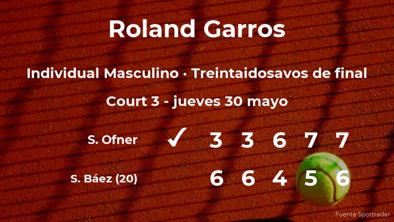 Sebastian Ofner, austriaco ganó en los treintaidosavos de final del torneo de París por 3-6, 3-6, 6-4, 7-5 y 7-6 (tras un desempate a 10 puntos en el último set) al tenista argentino Sebastián Báez, número 20 de la ATP y cabeza de serie número 20. Tras este resultado, seguiremos viendo al vencedor del partido en la siguiente fase del torneo de París, los dieciseisavos de final.