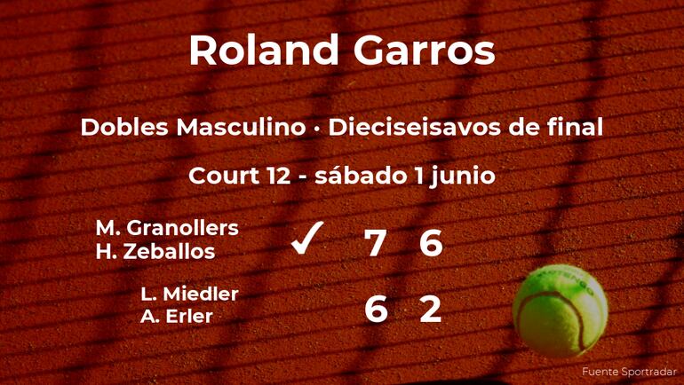 El tenista español Marcel Granollers y el argentino Horacio Zeballos vencieron en los dieciseisavos de final del torneo de París por 7(7)-6(3) y 6-2 a los austriacos Lucas Miedler y Alexander Erler. Con este resultado, la pareja estará en los octavos de final del torneo de París.