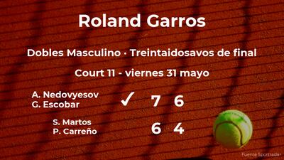 El tenista kazajo Aleksandr Nedovyesov y el ecuatoriano Gonzalo Escobar ganaron en los treintaidosavos de final del torneo de París por 7(7)-6(3) y 6-4 a los jugadores españoles Sergio Martos y Pablo Carreño. Con este resultado, la pareja consigue el puesto para los dieciseisavos de final del torneo de París.