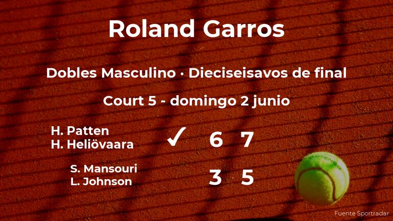 El jugador británico Henry Patten y el tenista finlandés Harri Heliövaara ganaron por 6-3 y 7-5 al tunecino Skander Mansouri y al británico Luke Johnson en los dieciseisavos de final del torneo de París. Con este resultado, veremos a los vencedores de este partido en los octavos de final del torneo de París.
