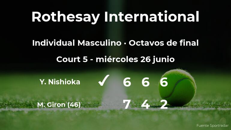 El tenista japonés Yoshihito Nishioka ganó en los octavos de final del torneo de Eastbourne por 6(8)-7(10), 6-4 y 6-2 a Marcos Giron, tenista estadounidense, número 46 de la ATP. Con este resultado, Nishioka logra clasificarse para la siguiente ronda del torneo de Eastbourne.