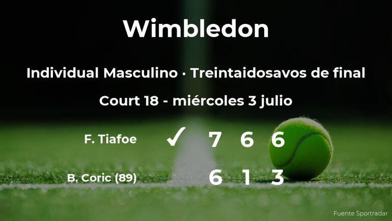 El tenista estadounidense Frances Tiafoe y cabeza de serie número 29, ganó en los treintaidosavos de final del torneo de Londres por 7(7)-6(5), 6-1 y 6-3 a Borna Coric, número 89 de la ATP. Con este resultado, el jugador estadounidense logra clasificarse para los dieciseisavos de final del torneo de Londres.