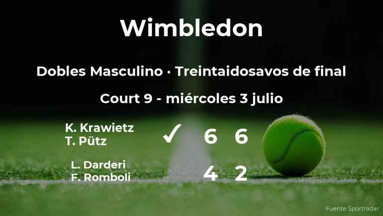Kevin Krawietz y Tim Pütz ganaron en los treintaidosavos de final del torneo de Londres por 6-4 y 6-2 al jugador italiano Luciano Darderi, número 37 de la ATP y al tenista brasileño Fernando Romboli. Tras este resultado, los tenistas se hacen con el puesto para los dieciseisavos de final del torneo de Londres.