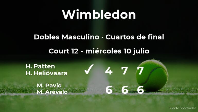 El jugador británico Henry Patten y el finlandés Harri Heliövaara ganaron por 4-6, 7(7)-6(5) y 7-6 (por un super tie-break) a Mate Pavic y Marcelo Arévalo en los cuartos de final del torneo de Londres. Tras este resultado, la pareja estará en la siguiente fase del torneo de Londres.