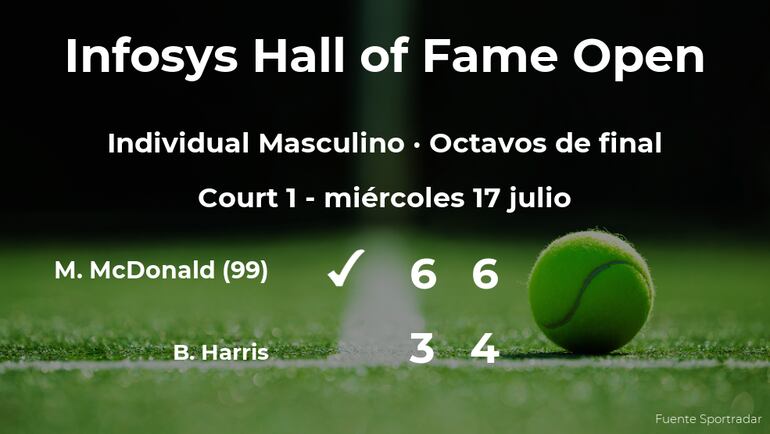 El tenista estadounidense Mackenzie McDonald, número 99 de la ATP, ganó por 6-3 y 6-4 a Billy Harris, tenista británico en los octavos de final del torneo de Newport. Con este resultado, seguiremos de cerca la trayectoria del jugador en la siguiente ronda de la competición.