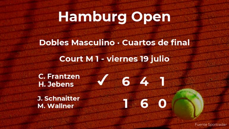 Constantin Frantzen y Hendrik Jebens vencieron por 6-1, 4-6 y 1-0 (para deshacer el empate) a Jakob Schnaitter y Mark Wallner en los cuartos de final del torneo de Hamburgo. Con este resultado, la pareja logra clasificarse para la siguiente fase del torneo de Hamburgo.