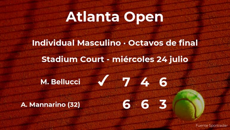 Mattia Bellucci, italiano venció por 7(8)-6(6), 4-6 y 6-3 al jugador francés Adrian Mannarino, número 32 de la ATP y cabeza de serie número 2, en los octavos de final del torneo de Atlanta. Tras este resultado, podremos seguir viendo al vencedor del partido en la siguiente fase del torneo de Atlanta, la siguiente ronda.