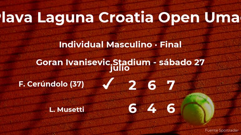 El jugador argentino Francisco Cerúndolo, número 37 de la ATP y cabeza de serie número 4, ganó por 2-6, 6-4 y 7(7)-6(5) a Lorenzo Musetti, tenista italiano y cabeza de serie número 2, en la final del torneo de Umag. Con este resultado, Cerúndolo es el nuevo campeón del torneo de Umag.