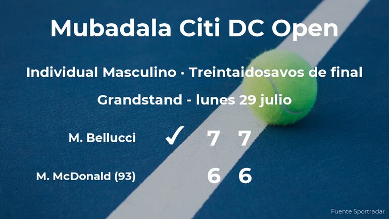 El italiano Mattia Bellucci ganó por 7(7)-6(4) y 7(7)-6(3) a Mackenzie McDonald, tenista estadounidense, número 93 de la ATP, en los treintaidosavos de final del torneo de Washington. Con este resultado, seguiremos viendo al ganador del partido en la siguiente fase del torneo de Washington, los dieciseisavos de final.