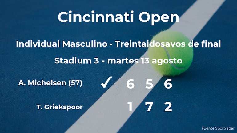 Alex Michelsen, estadounidense, número 57 de la ATP, venció por 6-1, 5-7 y 6-2 a Tallon Griekspoor, tenista en los treintaidosavos de final del torneo de Cincinnati. Tras este resultado, el tenista consigue clasificarse para los dieciseisavos de final del torneo de Cincinnati.