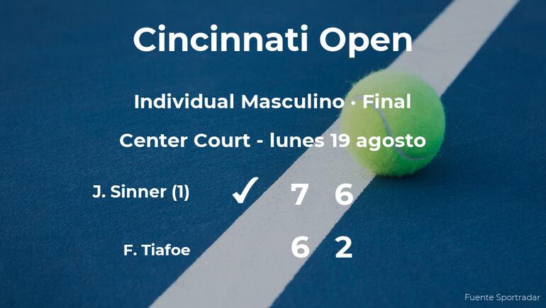 El jugador italiano Jannik Sinner, número 1 de la ATP y cabeza de serie número 1, venció en la final del torneo de Cincinnati por 7(7)-6(4) y 6-2 al jugador estadounidense Frances Tiafoe. Tras este resultado, el tenista se convierte en el nuevo campeón del torneo de Cincinnati.