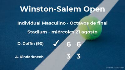 El belga David Goffin, número 90 de la ATP, ganó en los octavos de final del torneo de Winston-Salem por 6-3 y 6-3 al tenista francés Arthur Rinderknech y cabeza de serie número 12. Tras este resultado, seguiremos de cerca la trayectoria del jugador en la siguiente fase de la competición.