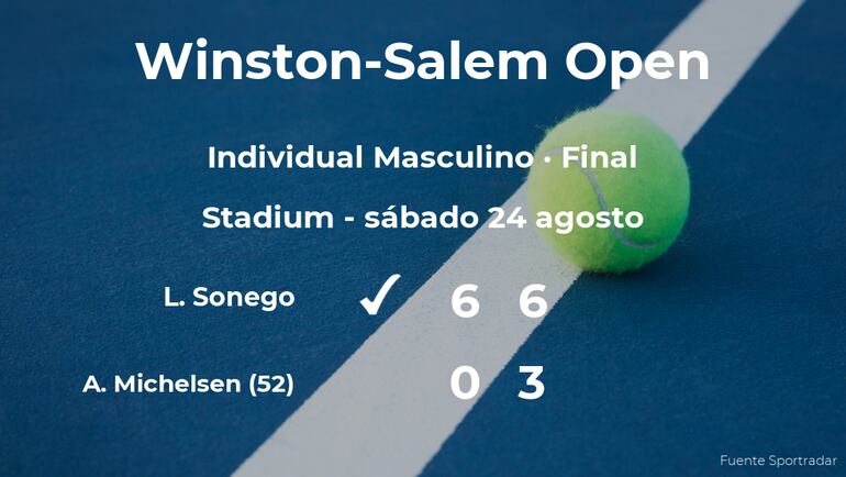 Lorenzo Sonego, italiano y cabeza de serie número 10, ganó por 6-0 y 6-3 a Alex Michelsen, tenista estadounidense, número 52 de la ATP y cabeza de serie número 11, en la final del torneo de Winston-Salem. Tras este resultado, el tenista se convierte en el nuevo campeón del torneo de Winston-Salem.